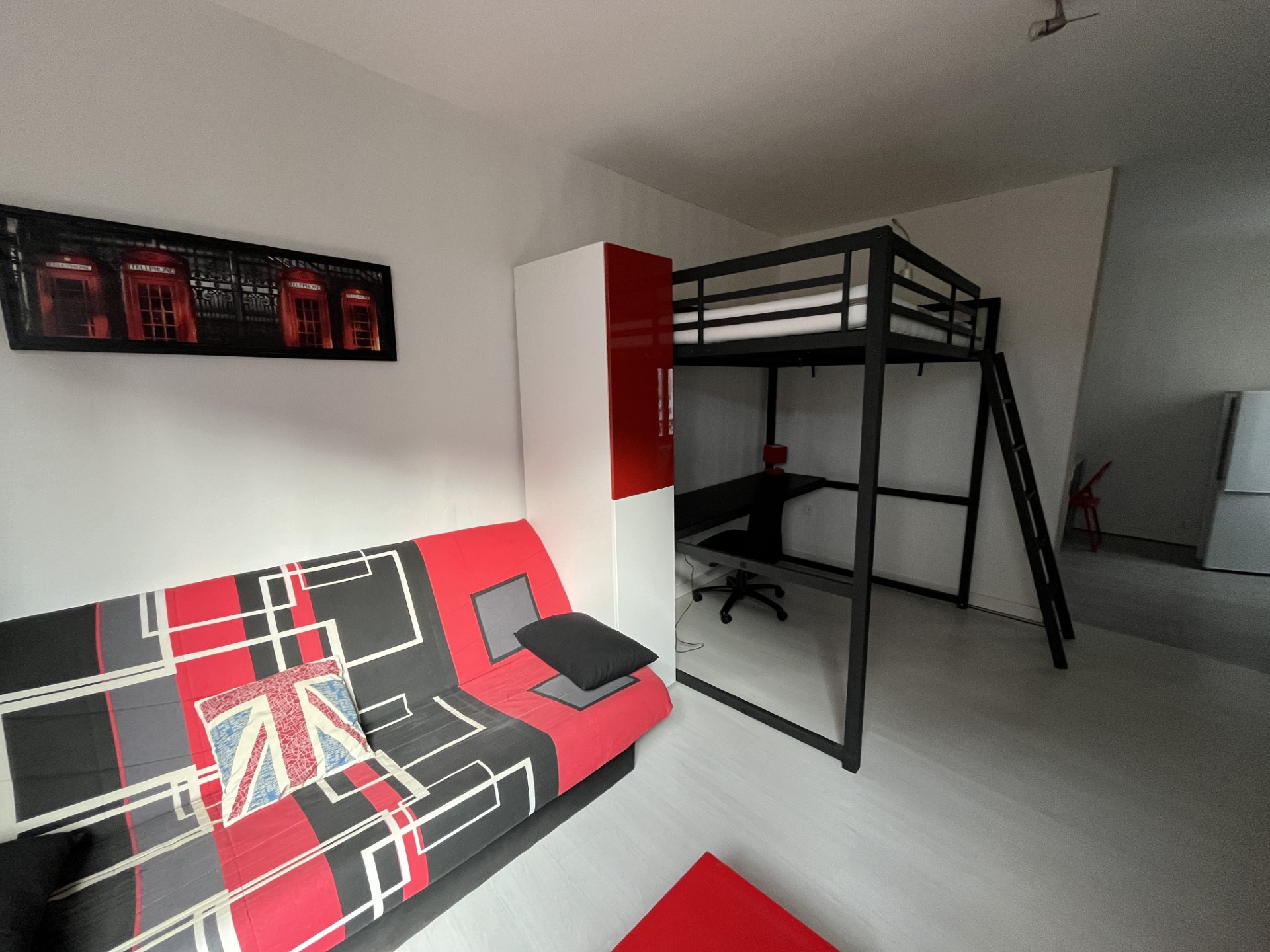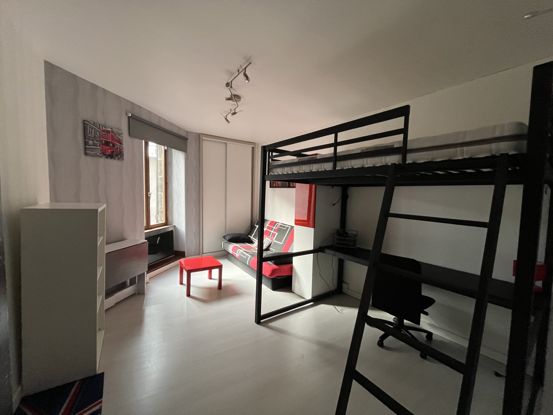 Il dispose d'une cuisine aménagée et équipée, d'un coin nuit et bureau avec un lit mezzanine double, d'un petit espace salon et d'une salle d'eau.