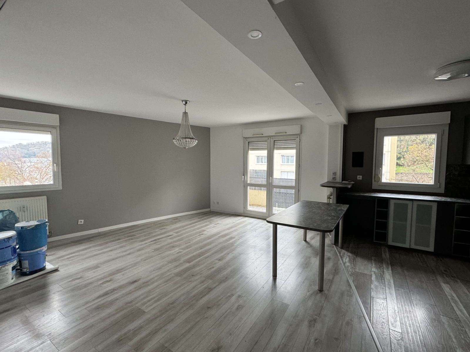 Un séjour spacieux et lumineux donnant sur une cuisine ouverte meublée et équipée (four, plaque de cuisson, lave-vaisselle,