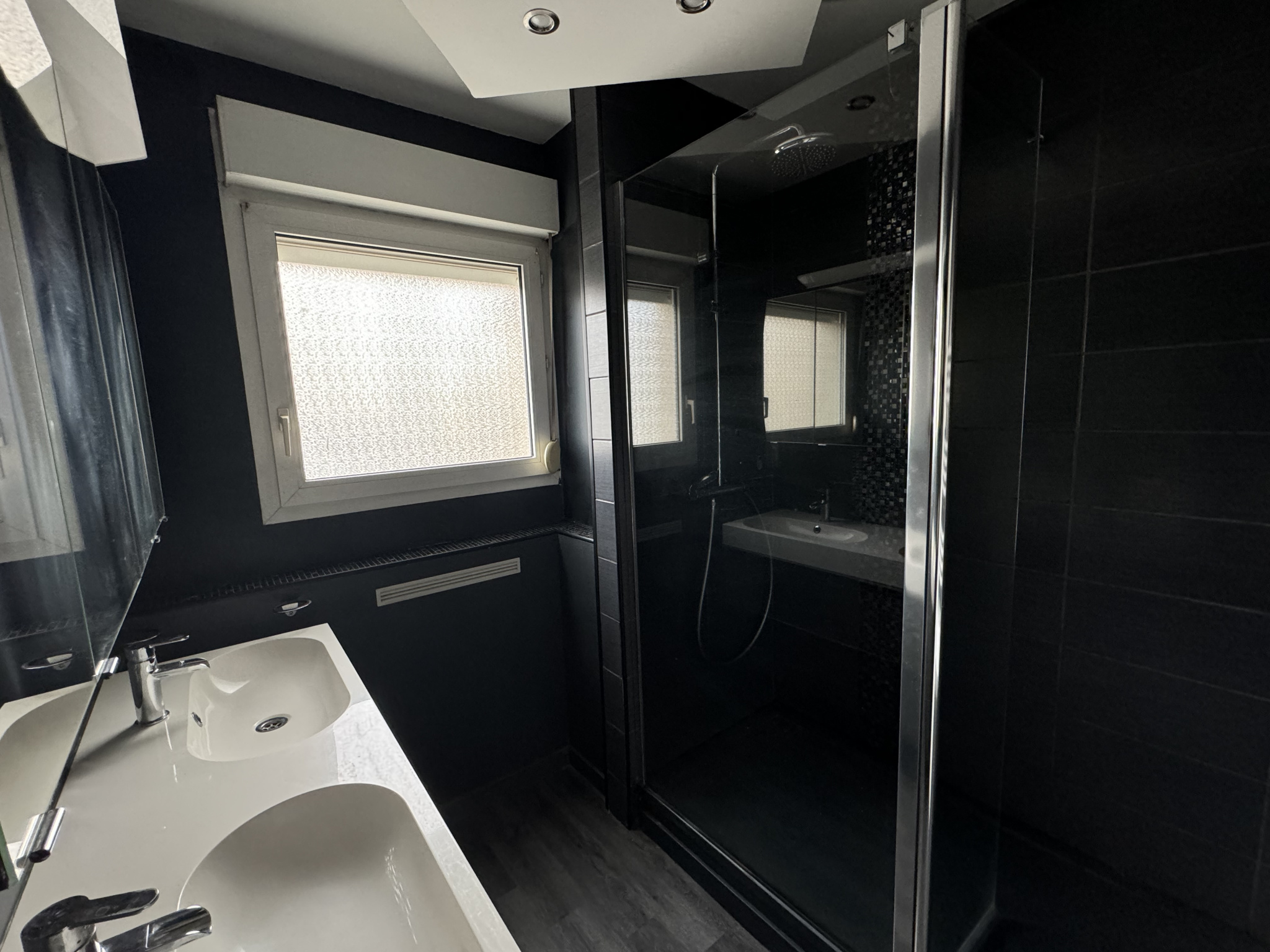 Une salle de bains avec douche et double vasque