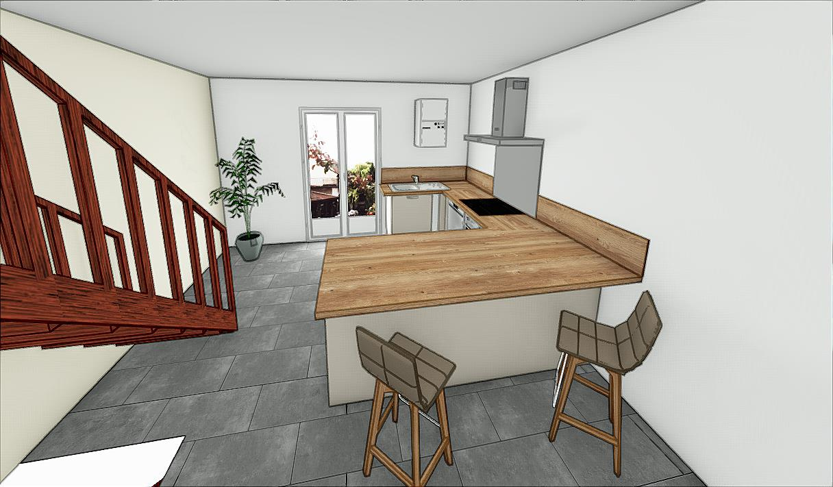 Au 1er étage : une cuisine récente meublée et équipée (plaque de cuisson, four et hotte) ouverte sur le séjour.
